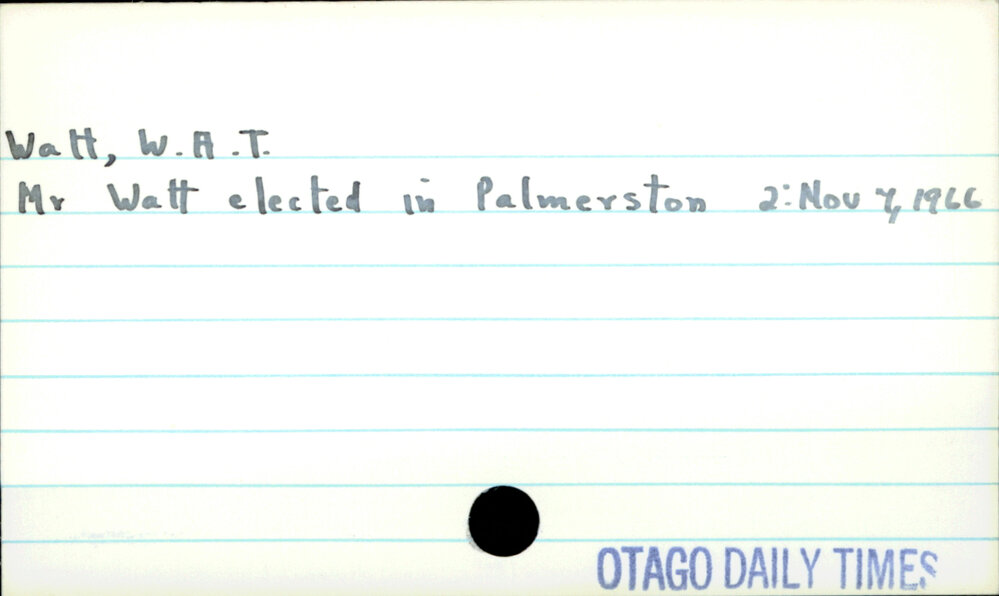 Dunedin Public Libraries (15th May 2023). Watt, W.A.T.. In Website Dunedin Public Libraries. Retrieved 21st Apr 2026 00:43, from https://dunedin.recollect.co.nz/nodes/view/95097