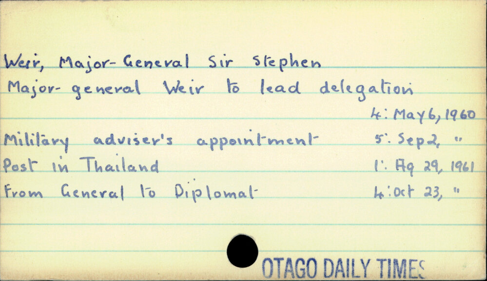 Dunedin Public Libraries (3rd Jun 2023). Weir, Stephen (Sir, Major-General, CE). In Website Dunedin Public Libraries. Retrieved 5th Apr 2026 21:45, from https://dunedin.recollect.co.nz/nodes/view/95641