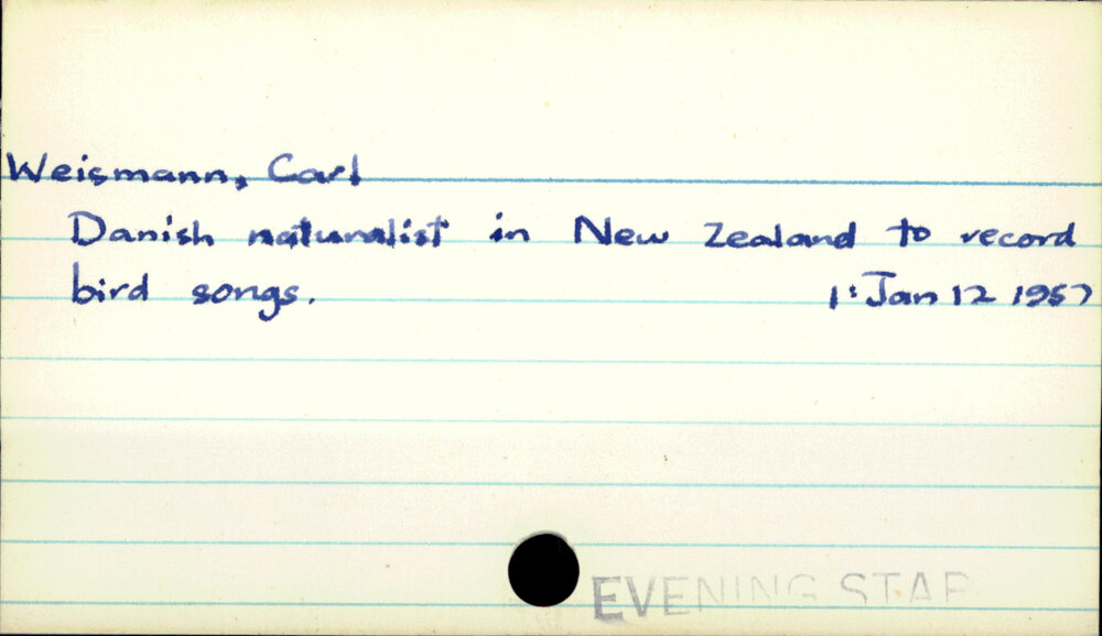 Dunedin Public Libraries (18th May 2023). Weismann, Carl . In Website Dunedin Public Libraries. Retrieved 5th Apr 2026 21:53, from https://dunedin.recollect.co.nz/nodes/view/95649
